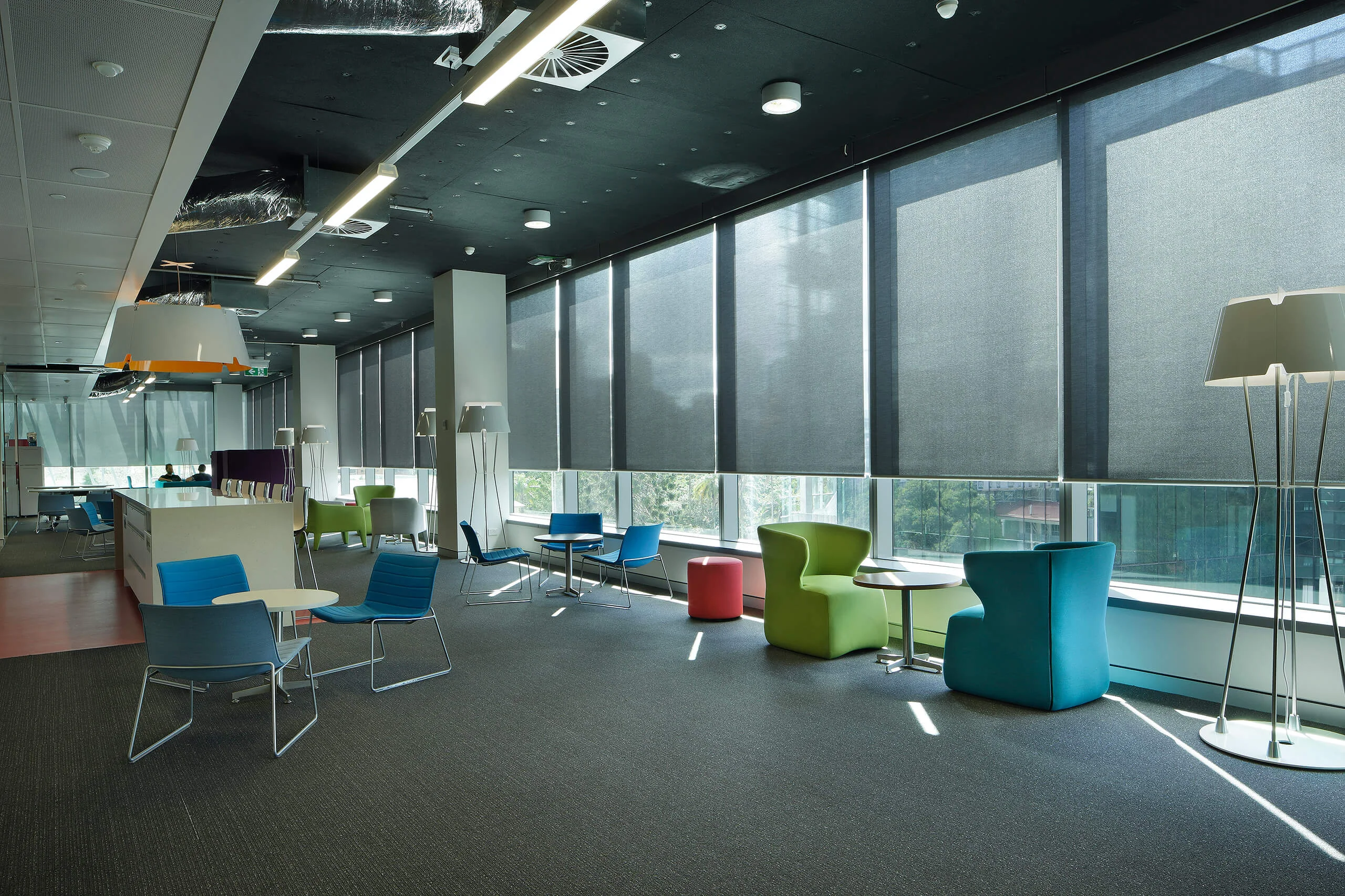 Seamlessly integrate natural daylight while preventing glare and maintaining privacy. Our user-friendly system allows for manual or automated adjustments, putting employees in control of their workspace ambiance. Embrace energy efficiency by managing solar heat gain, reducing cooling costs, and creating a work environment that aligns with sustainability goals.